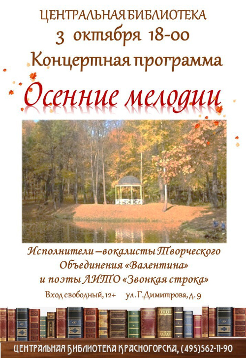 3 октября в 18.00 Центральная библиотека и Творческое Объединение «Валентина» приглашают на концертную программу «Осенние мелодии». Солистка – Валентина Пастухова.